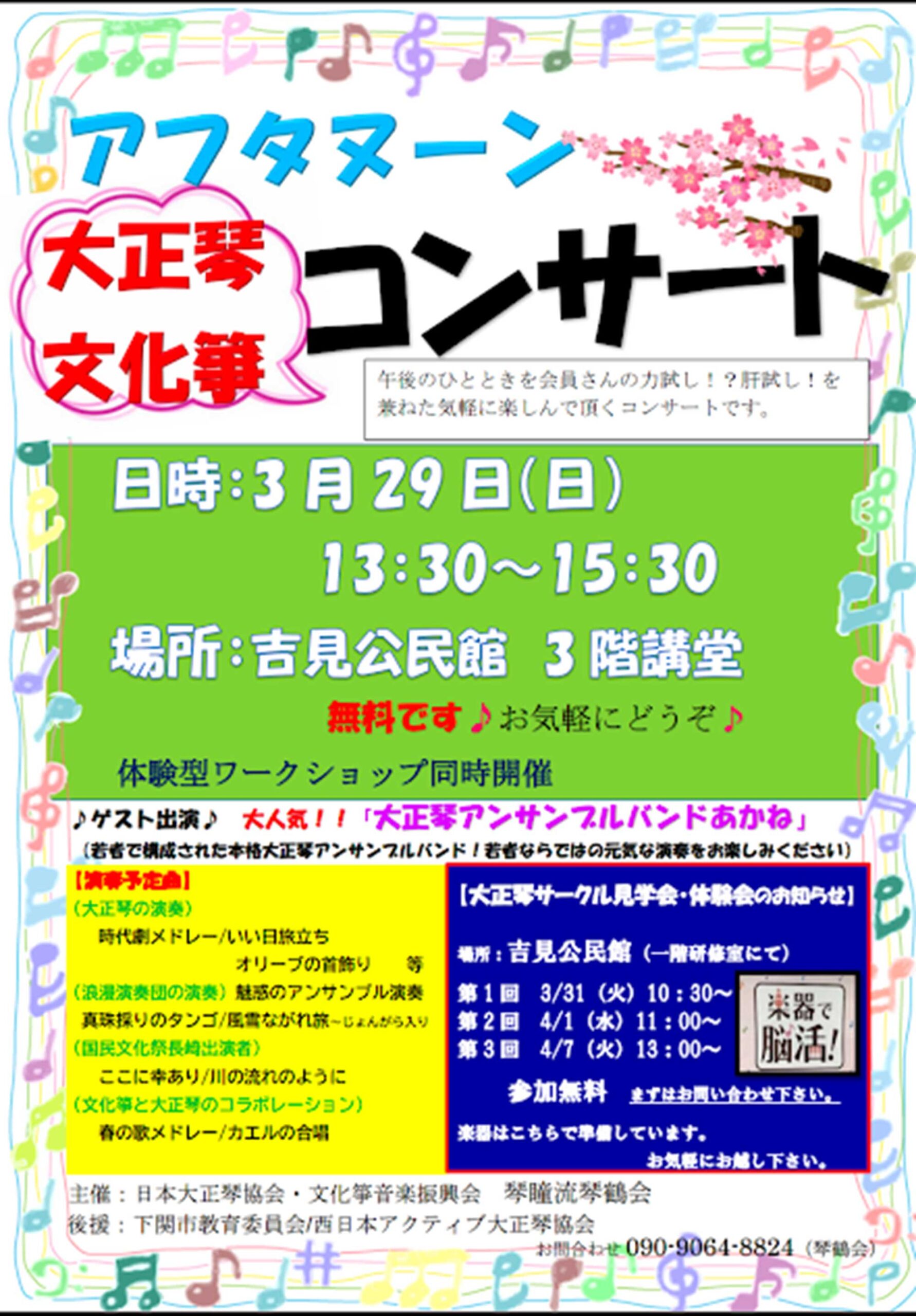 【開催告知】大正琴・文化箏アフタヌーンコンサート 2026 3/03 会員名 大正琴・文化箏 琴瞳流琴鶴会 開催日 令和8年3月29日(日) 時間 13:30~15:30 会場 下関市立吉見公民館講堂 入場料 無料 問い合わせ先 大正琴琴瞳流琴鶴会 090-9064-8824(琴鶴会) 新着情報 【開催告知】2026年つながる☆下関文化協会こどもカーニバル 【開催告知】俳誌「其桃」3月号を発行しました。 関連記事 【開催告知】俳誌「其桃」3月号を発行しました。 【開催告知】2026年つながる☆下関文化協会こどもカーニバル 【開催告知】第461回 講演『笑て感じる多様性〜ユニークな落語の住民たち〜』 【開催告知】みんなのコンサ-ト2026 下関音楽人の会創立30周年記念演奏会「祭」 令和8年度下関市文化協会定期総会及び懇親会の開催について(ご案内)